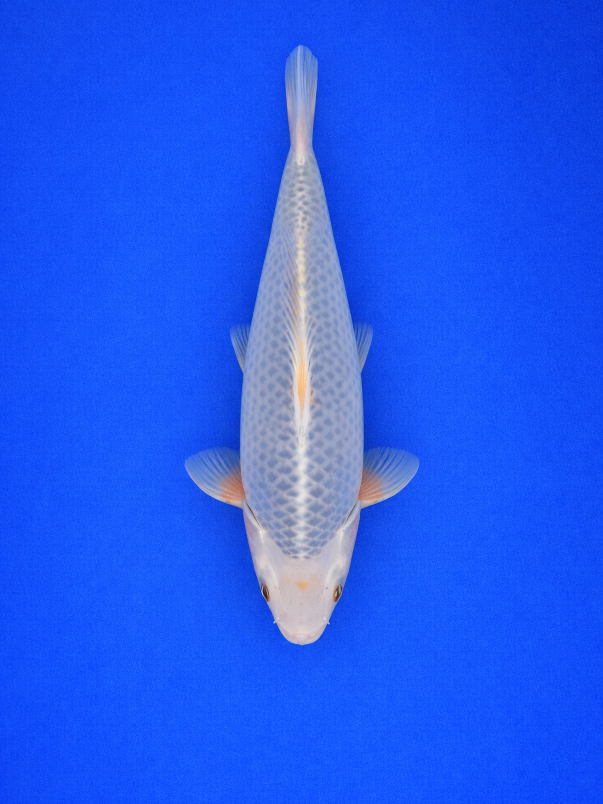 Koi Asagi- This graceful light-coloured koi displays a refined silver-white base overlaid with soft blue-grey reticulation that forms a neat, net-like pattern along the body. The clean head enhances the elegant appearance, while subtle warm orange tones in the pectoral fins add gentle contrast without overpowering the overall balance.